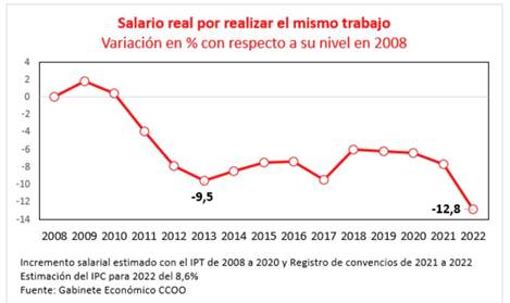 Pero si nos remontamos unos años más en el tiempo, según el Gabinete Económico de CCOO, la pérdida salarial real para un mismo trabajo y categoría desde 2008 al 2022 es del -12,8%.