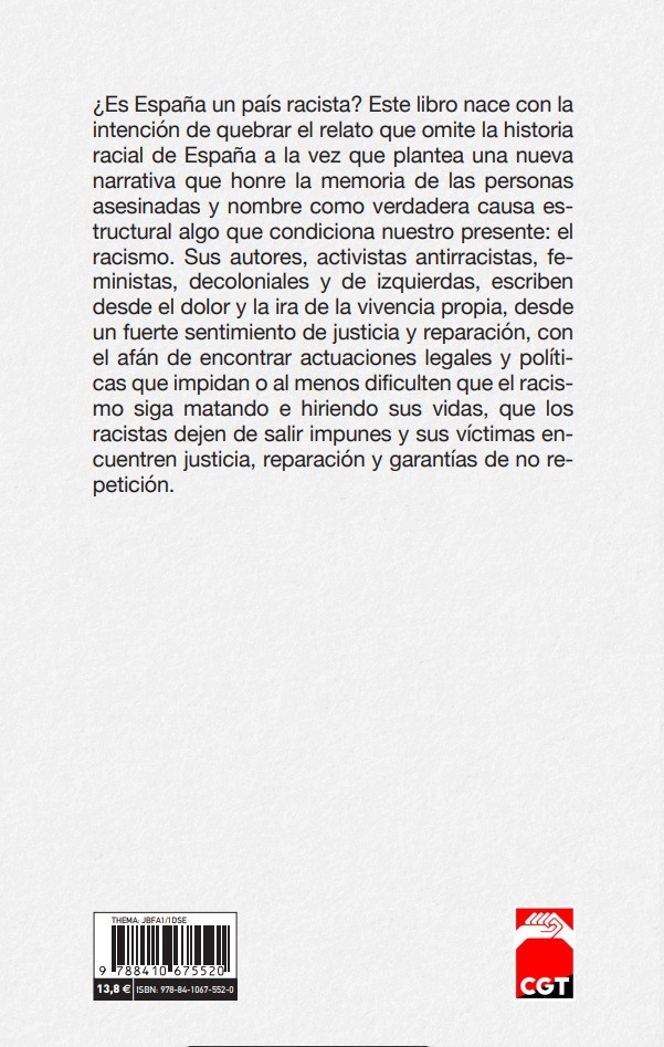 ¿Es España un país racista? Este libro nace con la intención de quebrar el relato que omite la historia racial de España a la vez que plantea una nueva narrativa que honre la memoria de las personas asesinadas y nombre como verdadera causa estructural algo que condiciona nuestro presente: el racismo. Sus autores, activistas antirracistas, feministas, decoloniales y de izquierdas, escriben desde el dolor y la ira de la vivencia propia, desde un fuerte sentimiento de justicia y reparación, con el afán de encontrar actuaciones legales y políticas que impidan o al menos dificulten que el racismo siga matando e hiriendo sus vidas, que los racistas dejen de salir impunes y sus víctimas encuentren justicia, reparación y garantías de no repetición.